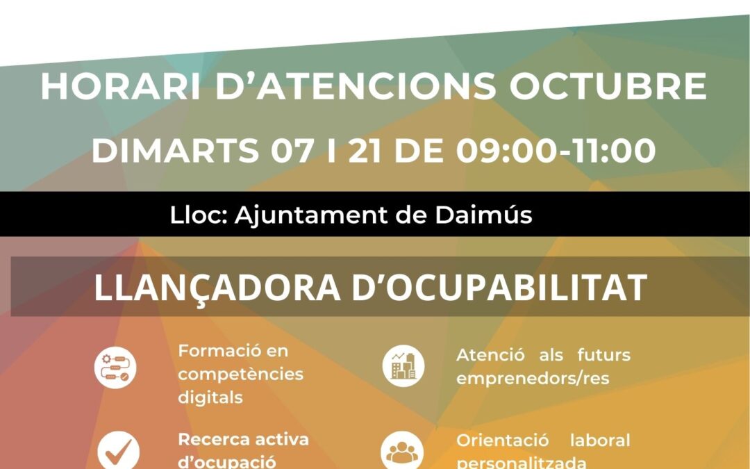 La Llançadora d’Ocupabilitat de la Mancomunitat de la Safor arriba a DAIMÚS el dimarts 07 i 21 d’octubre de 12 a 14h i et pot ajudar a: